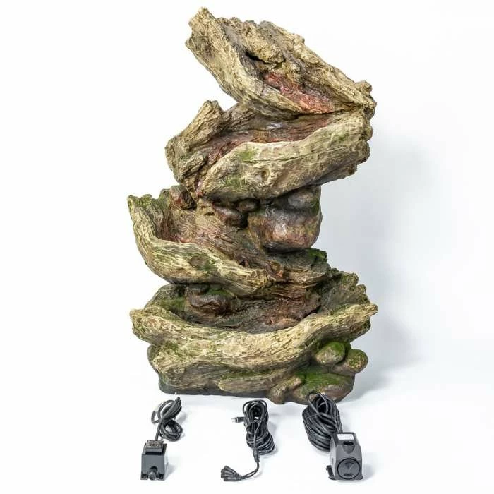 This fantastic water feature that has been cleverly disguised to appear as wood is actually made of high quality polyresin, which is both lighter and far more long-lasting than wood. It has been meticulously moulded to adopt the rough appearance and texture of natural wood, as though it has been shaped by the water over time. Combining classic looks and modern manufacturing techniques, polyresin is both frost and UV resistant, making this feature ideal for use all year round. LED lights situated in each tier not only illuminate the water feature but also delicately lighten and enhance the water itself, creating a simply stunning water feature which is great to watch during the day or night. A wonderful water feature guaranteed to enliven your surroundings.