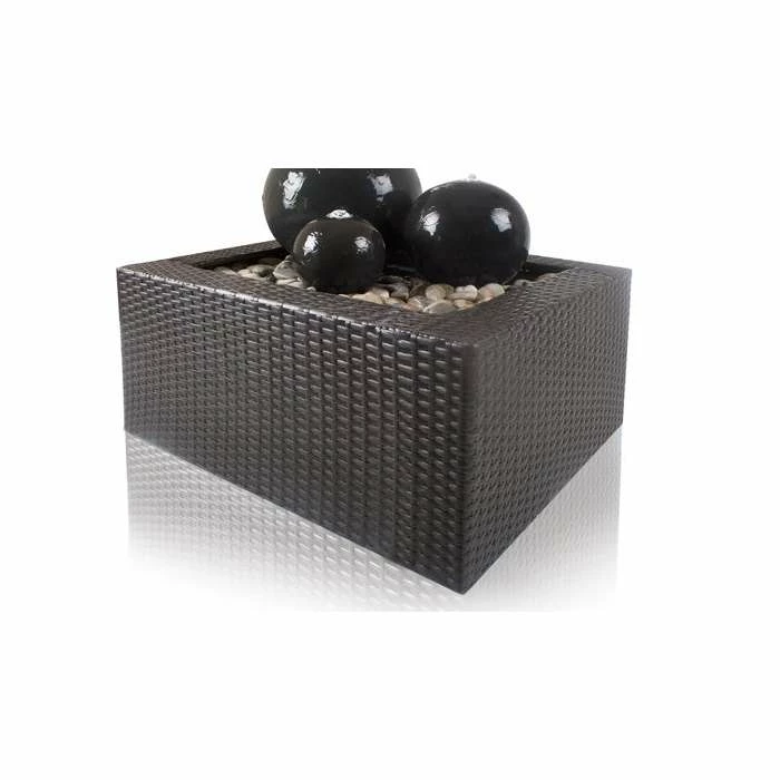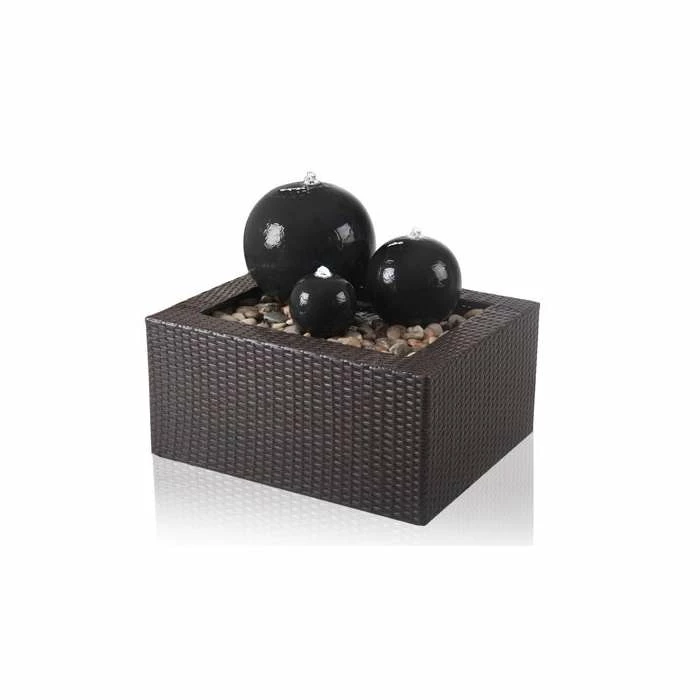 Transform your living space or garden with this gorgeous trio of stylish sphere water features, adorned with striking white LED lights and a display of moving water. The combination of the striking light, water flowing around the orb and glossy black ceramic gives an illuminating display. The set comes complete with a decorative rattan reservoir surround, perfectly sized to fit with the supplied water pump kit and reservoir.